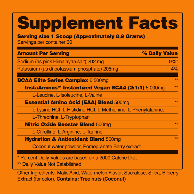 Składniki: Sód, Potas, Kompleks BCAA Elite Series, BCAA Instantized Vegan, Mieszanka niezbędnych aminokwasów, Mieszanka wzmacniaczy tlenku azotu, Mieszanka nawadniająca i antyoksydacyjna