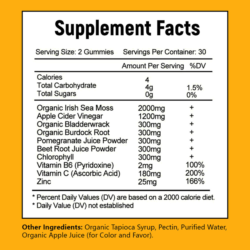 Organiczny mech irlandzki, organiczny pęcherznica, organiczny korzeń łopianu, ocet jabłkowy, proszek z soku z granatów, proszek z soku z buraków, cynk, witamina B6, witamina C, chlorofil