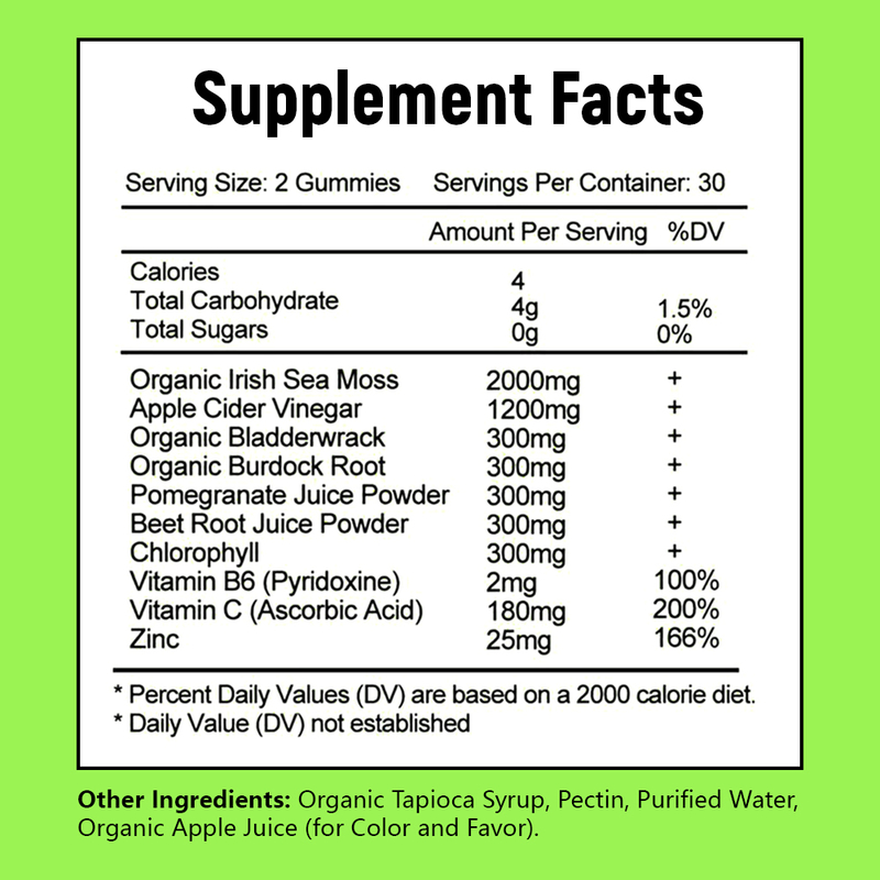 Organiczne irlandzkie wodorosty morskie, organiczny pęcherzyca, organiczny korzeń łopianu, ocet jabłkowy, proszek z soku z granatów, proszek z soku z buraków, cynk, witamina B6, witamina C, chlorofil