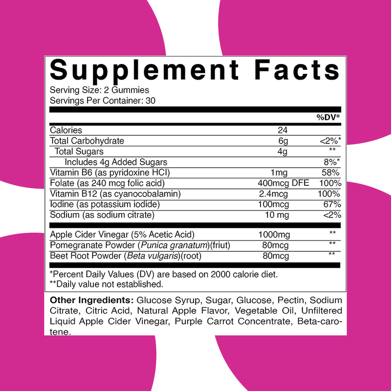 Ocet jabłkowy, Witamina B6, Folian, Witamina B12, Jod, Sód, Proszek z granatu, Proszek z buraka