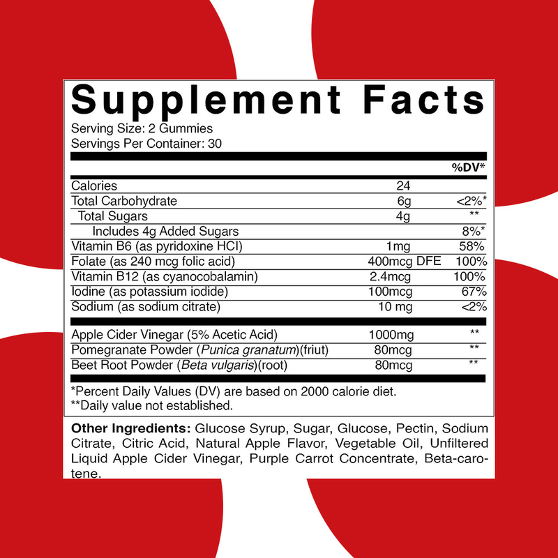 Ocet jabłkowy, witamina B6, kwas foliowy, witamina B12, jod, sód, proszek granatowy, proszek korzeni buraków
