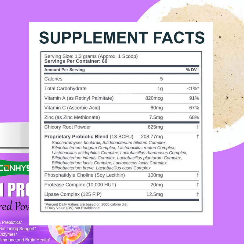 Witamina A, witamina C, cynk, proszek z korzenia cycory, specjalistyczna mieszanka probiotyczna, fosfatydylocholina, kompleks proteazy, kompleks lipazy