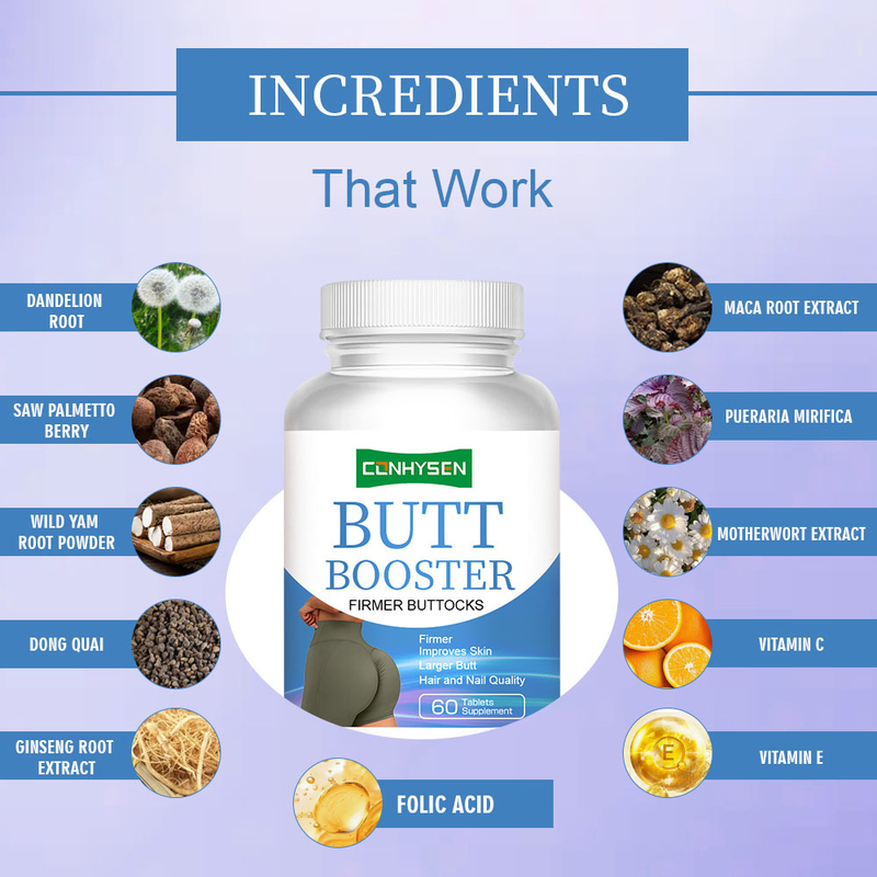 Produkt Butt Booster TabletyGuangdong Kangsheng Pharmaceutical Technology Co., Ltd.zawiera bogate ilości estrogenów roślinnych i składników kolagenu, może stymulować wzrost i rozkład komórek tłuszczowych w pośladku,pomaga naturalnie i bezpiecznie zwiększyć objętość pośladkówJeśli nadal będziesz go przyjmować, twoje pośladki staną się grubsze i zaokrąglone, z atrakcyjniejszymi zakrętami.