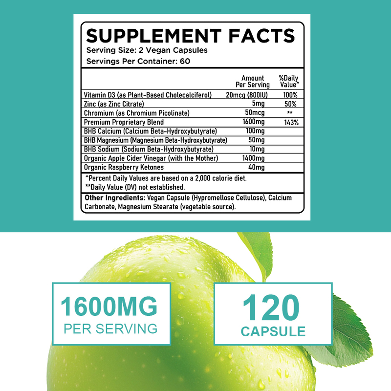 Ekologiczny ocet jabłkowy, witamina D3, cynk, chromium, specjalna mieszanka, BHB wapń, BHB magnez, BHB sód, ekologiczne ketony malinowe