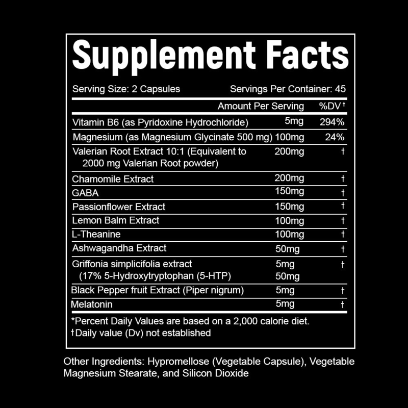 Witamina B6, magnez, ekstrakt z korzenia waleriany, ekstrakt z rumianku, GABA, ekstrakt z pasji, ekstrakt z cytryny, L-teanina, ekstrakt z ashwagandhy, ekstrakt z Griffonia simplicifolia,Ekstrakt z owoców pieprzu czarnegoMelatonina