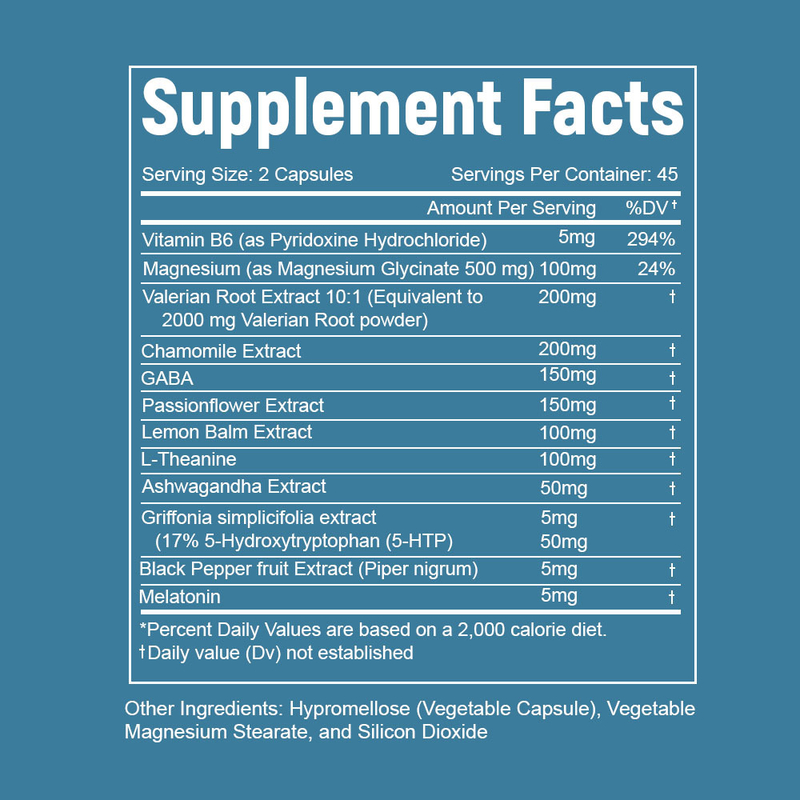 Witamina B6, magnez, ekstrakt z korzenia waleriany, ekstrakt z rumianku, GABA, ekstrakt z pasji, ekstrakt z cytryny, L-teanina, ekstrakt z ashwagandhy, ekstrakt z Griffonia simplicifolia,Ekstrakt z owoców pieprzu czarnegoMelatonina