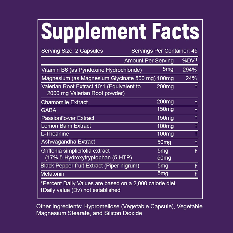 Witamina B6, magnez, ekstrakt z korzenia waleriany, ekstrakt z rumianku, GABA, ekstrakt z pasji, ekstrakt z cytryny, L-teanina, ekstrakt z ashwagandhy, ekstrakt z Griffonia simplicifolia,Ekstrakt z owoców pieprzu czarnegoMelatonina